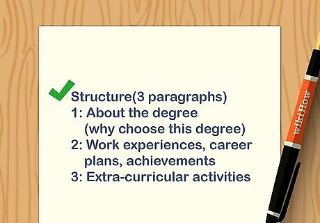 Outline the basic structure of your statement. You will generally only have 1-2 pages to fit all of your information into your statement. Outlining your statement before you write will make sure you cover all your most salient points in your limited space. Try to pick 2-4 critical points to cover. Prioritize the purpose of your statement in your outline. For example, if you're applying to a graduate program, your graduate project should be your main focus. Write about what interests you. You will be able to write more convincingly and more passionately if you write about events, goals, experiences, or ideas that you already feel passionate about. Address issues specifically brought up by the institution or organization. If there are any topics that the reader demands to see, then make sure that those are included in your personal statement.