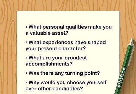 Ask yourself why you should be chosen. You will likely have plenty of competition, so you need to thoroughly describe what sets you apart from the rest of the crowd. Before you can convince the reader of your uniqueness, you need to convince yourself. Ask yourself a range of questions, such as: What personal qualities (leadership skills, organizational skills, self-control, etc.) do you possess which make you a valuable asset? What experiences and beliefs have shaped your present character? What accomplishments make you the proudest? Have you had any turning points that redirected your life in a positive way? Why would you choose yourself over other candidates? Why should anyone else?