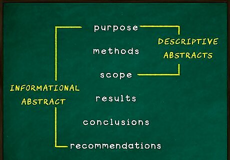 Know which type of abstract you need to write. An abstract can either be informational or descriptive. An informational abstract states the purpose, methods, scope, results, conclusions, and recommendations included in your report. The abstract should highlight essential points in order to allow the reader to decide whether or not to read the rest of the report. Its total length should be about 10 percent or less of the length of the report. Descriptive abstracts include the purpose, methods, and scope defined in the report, but not the results, conclusions, or recommendations. These abstracts are less common to APA style and usually fall under 100 words. The purpose is the introduce the subject to the reader, essentially teasing the reader into reading the report in order to learn the results.