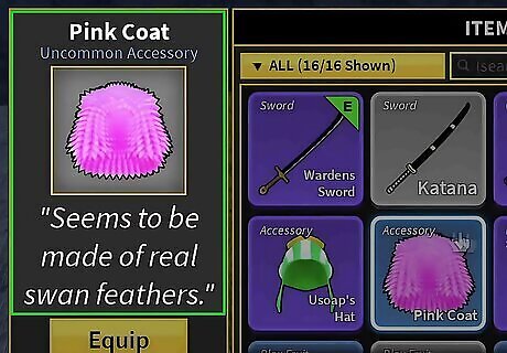 Pink Coat. Get this coat by beating the Swan Boss in the Prison of First Sea. Get +10% Gun damage, +200 health. If you aren't sure which to use, know that the Pink Coat only buffs the damage from Guns. So if you're looking for a damage boost if you're using a sword, this accessory won't help you.