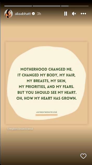 Taking to Instagram Alia Bhatt shared a post by Sandra whose page is named ‘mybestmomfriend’ on her story. The post read, “Motherhood changed me. It changed my body, my hair, my breast, my skin, my priorities, and my fears. But you should see my heart, oh, How my heart has grown.”