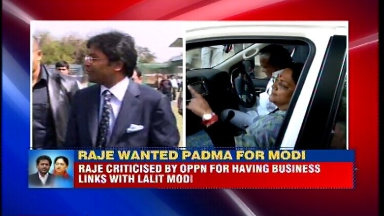 Jaipur: There seems to be end to trouble for Rajasthan Chief Minister Vasundhara Raje over her links with former Indian Premier League chief Lalit Modi. Details have emerged which showed that Raje had recommended Modi's name for Padma Award in 2007 during her tenure as the chief minister.
