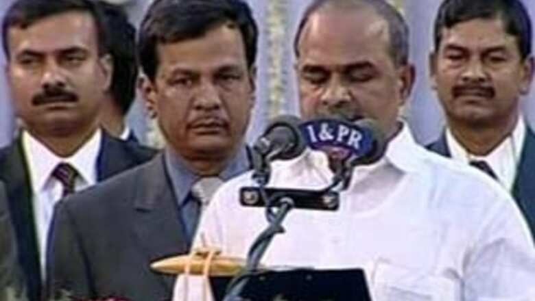 Clad in a white kurta and his trademark dhoti, Rajasekhara Reddy, 60, took oath in Telugu amid fireworks outside the stadium.
