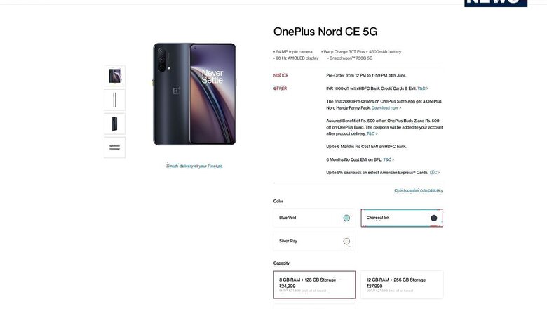 On the OnePlus India online store, the OnePlus Nord CE 5G goes Live for preorders for all three, 6GB+128GB, 8GB+128GB and 12GB+256GB options. Mind you, the first variant is only available in Charcoal Ink colour and is priced at Rs 22,999. The other two options also have the choices of the Blue Void and Silver Ray colours. On the OnePlus India online store, there is a Rs 1,000 discount for all HDFC bank credit card payments, including those converted to EMI. The EMI option is also available as No Cost EMI for a tenure up to 6 months. If you are making the purchase using an American Express credit card, there is a cashback of up to 5% that is lined up. OnePlus also says that the first 2000 orders on the OnePlus Store app will also get a OnePlus Nord Handy Fanny Pack. There are also assured benefits of Rs 500 on the OnePlus Buds Z wireless earbuds as well as the OnePlus Band, if you choose to bundle those along as well.